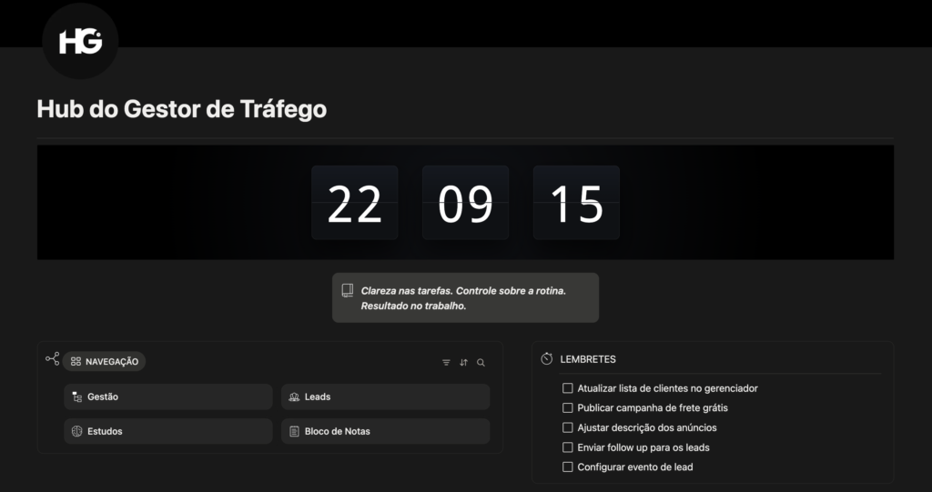 O Hub do Gestor é um template completo no Notion, criado ao longo de 2 anos de experiência em agência, para centralizar tarefas, demandas e prioridades de quem gerencia múltiplos clientes ao mesmo tempo